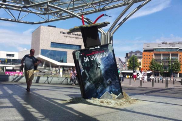 전광판이 거꾸로 돌바닥에 꽂혀있습니다. 마치 저 멀리에서부터 날아와 저 광장에 불시착한 것 처럼 보이는데요. SF영화 홍보에는 가장 어울리는 옥외광고가 아닐까 싶습니다. 영화 인디펜던스 데이의 광고입니다 :)