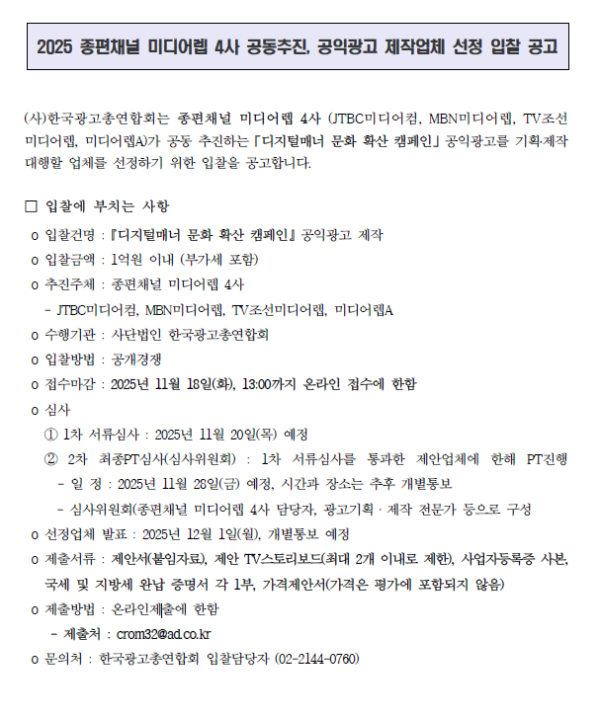 [입찰공고문] 2025종편채널 미디어렙 4사 공동추진 공익광고 제작 업체선정 입찰공고문_251020.pdf