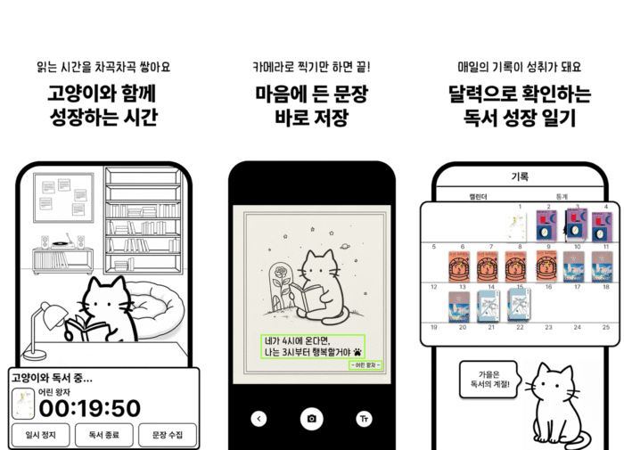 독서를 취미로 삼는 Z세대가 늘어나면서, 북커버·책갈피 같은 ‘독서템’은 물론 독서 활동을 도와주는 다양한 앱들도 인기를 끌고 있어요. 그중 요즘 Z세대 사이에서 화제를 모은 앱이 바로 ‘고양이 책집사’예요. 이름처럼 귀여운 고양이와 함께 책을 읽는 콘셉트를 기반으로, 독서 시간 자체를 더 즐겁게 만들어주는 앱입니다.
