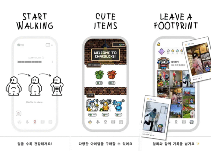 이 앱의 핵심은 사용자가 걸을수록 ‘찰리’도 함께 건강해진다는 점이에요. 걸음 수에 따라 찰리의 체형이 달라지거든요. 산책을 게을리하면 찰리가 통통해지고, 다이어트에 성공하면 복근까지 생기죠. 이렇게 귀엽고 눈에 보이는 변화는 지속적인 걷기를 유도하는 재미 요소로 작용하고 있어요.