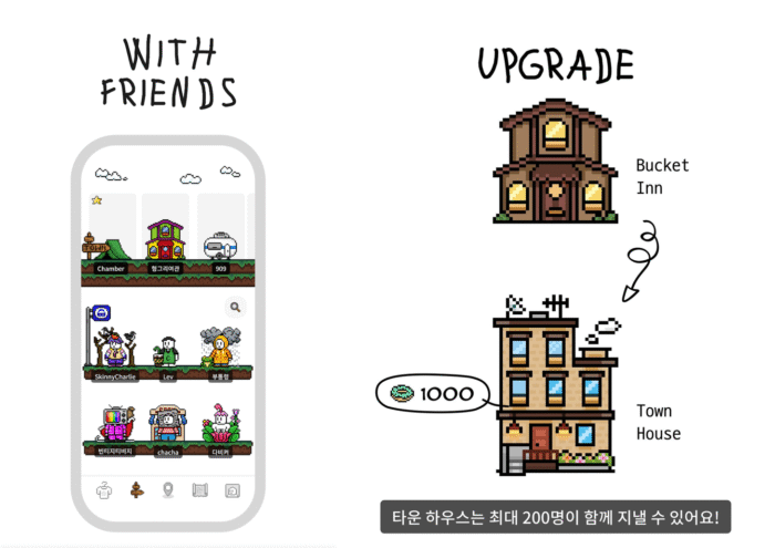 ‘찰리와 걷기’에는 친구와 함께 즐길 수 있는 소셜 기능도 탑재되어 있어요. 다른 유저들과 같은 공간을 공유하며 서로의 활동을 확인하는 ‘하우스’라는 시스템인데요. 같은 하우스에 소속된 친구들은 서로의 걷기 스코어를 확인할 수 있고, 알람 벨을 눌러 오랫동안 앱에서의 활동이 없던 친구를 깨우는 기능도 있죠. 또한 하우스 멤버들이 함께 도넛을 기부하여 집을 넓히거나, 누가 더 많이 기부했는지 등의 랭킹을 매기기도 합니다. 서로를 응원하면서도 은근한 경쟁심을 자극해, 꾸준한 활동을 도와주는 셈이에요.
