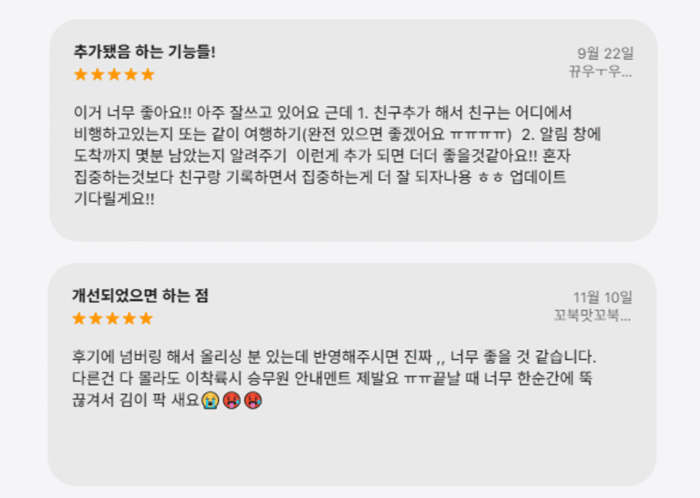Focus Flight에 대한 사용자 후기를 보면, 기능 만족도뿐 아니라 확장 아이디어에 대한 피드백도 굉장히 활발해요. 예를 들어 친구와 같은 비행기에 탑승하기, 실시간으로 친구가 어디까지 날아갔는지 확인하기, 팝업창으로 남은 비행 시간 표시하기 같은 의견들이 대표적이죠. 앞서 소개한 ‘찰리와 걷기’처럼, 소소한 일상을 타인과 연결해 기록하고 응원하고 싶은 Z세대의 참여 방식이 이 앱에서도 자연스럽게 엿보이는 듯합니다.
