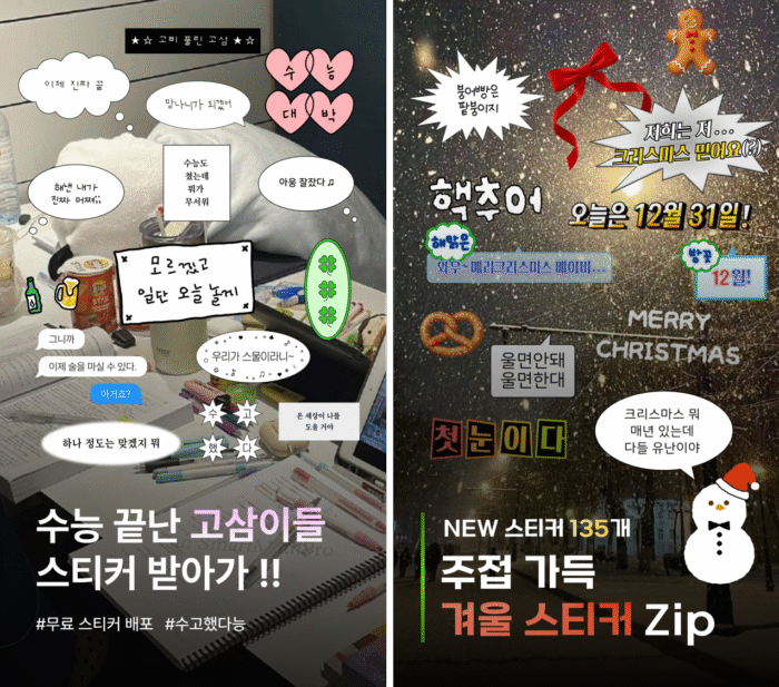 인스타그램 스토리 꾸미기는 트렌드도 정말 빨리 바뀌는데요. 그만큼 스티커도 발빠르게 유행을 쫓아가야겠죠! 그래서 ?은 Z세대가 주로 사용하는 밈이나 빼빼로데이, 수능처럼 타이밍이 중요한 시즌 이슈에 맞춰 스티커를 신속하게 업데이트하는 것이 특징이에요. 또한 ?의 인스타그램 공식 계정에서는 시즌 스티커를 활용한 꾸미기 팁도 함께 소개하고 있어, 스토리 꾸미기에 익숙하지 않은 유저도 쉽게 따라 할 수 있도록 돕고 있답니다.