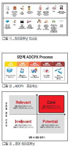 완성된 라이프유닛 리스트를 기반으로, 라이프셰어 마케팅을 실전에서 구현하기 위한 전략 수립 절차를 ‘5단계 ADCPX 프로세스’라고 이름지었다. 1단계 분석(Analysis), 2단계 진단(Diagnosis), 3단계 구성(Configuration), 4단계 포지셔닝(Positioning), 5단계 실행(eXecution)이 그것이다(그림 2).