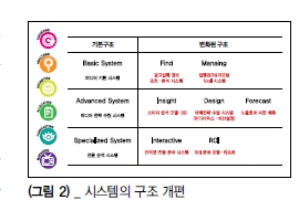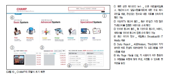 메뉴만으로 이루어진 기존 시스템의 초기 화면은 사용자에게 전략 모델이나 미디어 자료에 대한 정보를 제공할 수 없어 사용자 교육을 받았거나, 잘 알고 있는 사람만 쓸 수 있다는 한계가 있었다. 이에 사용자 편의를 극대화하고 실질적 업무 지원으로 효율성을 높이기 위해 채택한 포털식 UI(User Interface)는 최신의 업데이트 된 미디어 정보를 손쉽게 확인하고 제공받을 수 있다(그림 1).