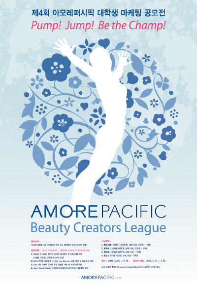 아모레퍼시픽 제4회 대학생 마케팅 공모전에 해당하는 ‘AMOREPACIFIC Beauty Creators League’는 마케팅기획 분야의 가장 대표적인 공모전으로 올해 “Pump! Jump! Be the Champ!”라는 캐치프레이즈로 진행된다.
