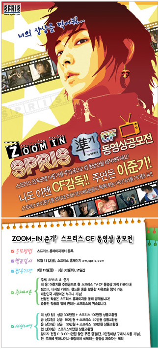 이준기의 스프리스 모델 계약을 기념하기 위해, 스프리스 C.F 동영상 공모전을 아래와 같이 실시합니다. 많은 관심과 참여 부탁드립니다.