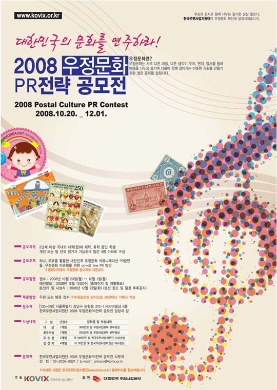 PR산업의 성장이 급격히 이루어지고 있는 시점에서 우정문화에 대한 대학생들의 인식과 관심을 높이고자 우정문화콘텐츠를 활용한 PR전략을 발굴, 시상함으로써 대한민국 우정문화 확산 및 발전에 공헌하고 예비 PR인들의 양성에 기여하고자 2008「우정문화PR전략 공모전」응모작을 공모합니다.