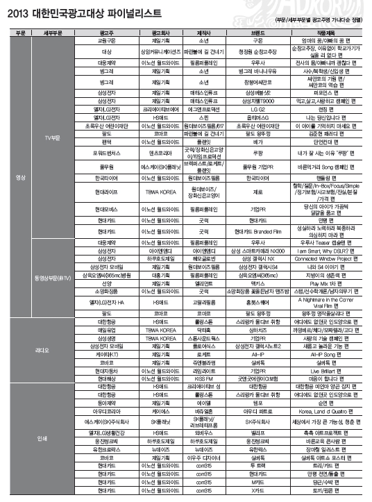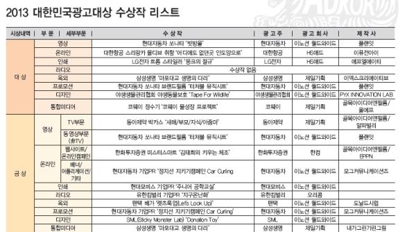 한국광고협회가 올해로 20년을 맞은 ‘2013 대한민국광고대상’ 7개 부문 대상 수상작을 포함한 총 44개 수상작을 발표했다. 올해로 20년을 맞은 2013 대한민국광고대상은 그 어느 해 보다 수상작들의 크리에이티브가 돋보였다.