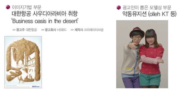 또한, 대한민국광고대상의 꽃인 최고의 광고 모델상은 △‘KT 올레-All IP’ 캠페인에 출연해 경쾌한 CM송으로 깊은 인상을 안겨준 남매듀오 악동뮤지션이 선정되었다.