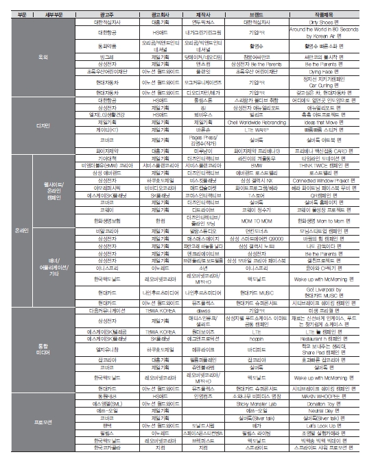 부문별 대상 수상작은 7편으로 △디자인부문 <야생생물관리협회 ‘Tape for Wildlife’ 편(이노션 월드와이드)>으로 택배 박스 테이프를 자르는 행위를 밀렵행위와 연관시켜, 동물그림이 삽입 된 박스테이프를 우체국과 택배 회사에 무료 배포하여 큰 호응을 얻은 작품이다. △영상부문 <현대자동차 쏘나타 ‘빗방울’ 편(이노션 월드와이드)>은 누구나 자동차 안에서 한번쯤 느꼈을 법한 감성적인 순간들을 새로운 시각에서 표현해 큰 호응을 얻었다. △옥외 부문 <삼성생명 ‘생명의 다리’ 캠페인(제일기획)> 은 ‘자살대교’라는 오명의 마포대교를 위로와 희망을 주는 힐링 명소로 탈바꿈시켜 큰 호응을 얻었다. △온라인 부문 <대한항공 ‘어디에도 없던 곳 인도양으로’캠페인(HS애드)>는 취항지의 매력을 극대화하는 영상미, 취항지를 새롭게 바라보는 시선과 독특한 광고 포맷, ‘인도양 여행기’ 책자 출간 등 온·오프라인을 아우르는 신선한 IMC전략으로 큰 호응을 얻었다 △인쇄 부문 <LG전자 ‘스타일러 없었으면 짜증 좀 났을 거다’ 캠페인(HS애드)>는 '스타일러 없었으면 짜증 좀 났을 거다' 라는 카피와 뭉크의 그림 ‘절규’로 퇴근 후 쌓여있는 빨랫감을 발견한 워킹맘들의 심정을 표현해 큰 호응을 얻었다.