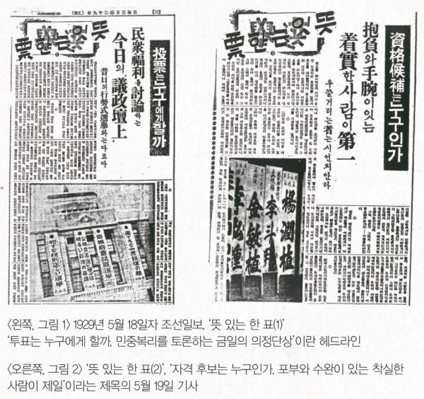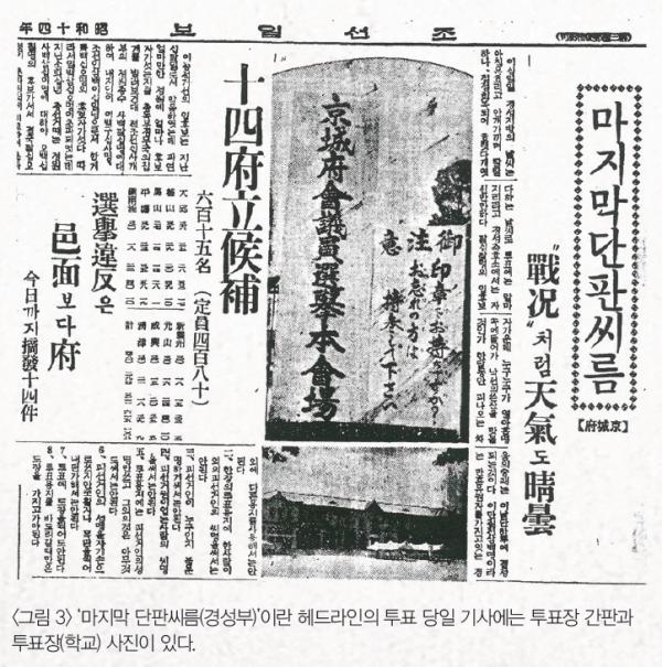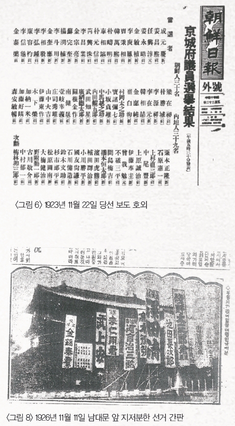 한국이 일본의 식민지라는 것은 서울시 의회 당선자의 수를 보면 알 수 있는데 69석 가운데 일본인이 39석으로 한국인보다 9석이 더많다. 서울(경성) 경찰국 조사에 의하면 1939년 조선일보 발행부수는 59,394부였다. 비록 보통선거는 아니었으나 선거의 중요성을 알리는 데 신문이 노력한 것은 선거 기사를 연재 기사로 다룬 일 그리고 기사 제목은 한문이었으나 본문은 모두 한글로 쓴 것에서도 엿볼 수 있다. 1926년 선거에서는 입후보자의 이름이 든 간판이 남대문 입구를 뒤덮고 있던 것을 보면 13년 사이에 선거에 대한 인식이 많이 변했음을 알 수 있다<그림 8>.