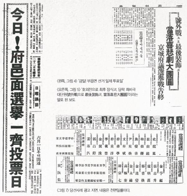 그리고 선거일인 5월 21일자 신문에는 드디어 ‘금일! 부읍면 선거 일제 투표일(今日!府邑面選擧一齊投票日)’이라는 커다란 제목이 신문 지면을 장식하게 된다<그림 4>. 이튿날 5월 22일에는 호외가 나오는 데 조선인(朝鮮人) 30명, 내지인(일본인) 39명의 이름이 나온다. 이틀 뒤에는 ‘호외전(號外戰)으로 최후장식(最後裝飾). 당락 희비극 대단원’이란 기사에서 서울시 의원선거에서 탈락한 19명의 이름이 있