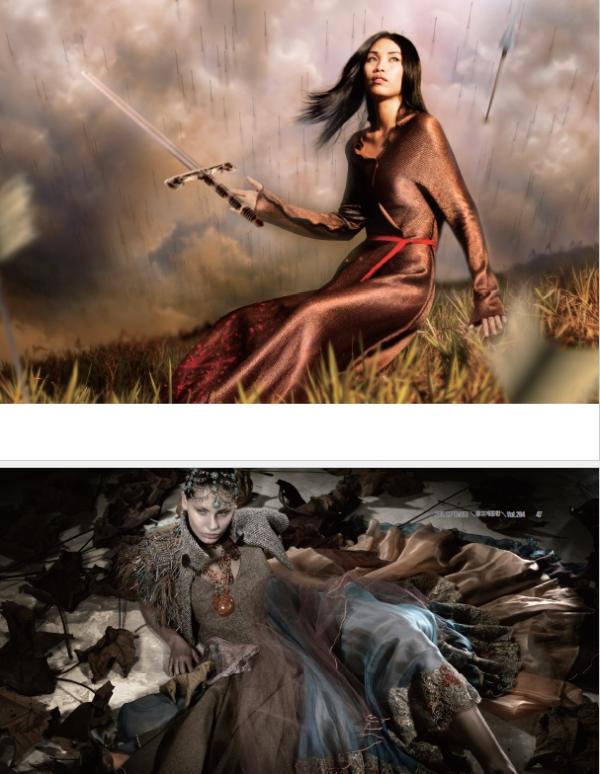 모델이 칼을 들고 있는 첫 번째 사진은 잡지 사진으로, 두 개의 작은 금속을 함께 붙여 만든 옷장에서 아이디어를 얻었습니다. 전쟁의 갑옷 같은 느낌으로, 2차원적 평면에 칼과 화살로 3차원의 세계를 표현하려고 하였습니다.