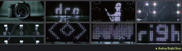 이미지와 사운드의 만남. 세 번째 소개할 영상은 일본의 밴드인 Androp의 뮤직비디오 영상입니다. 그들의 신곡을 소개한 뮤직비디오 뒤에는 250대의 캐논카메라가 설치되어 있고 연주를 시작하면 멋진 플래시 퍼포먼스와 노래가 펼쳐집니다.