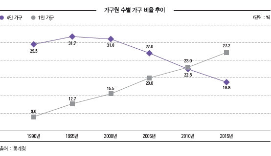 이런 심리적 마뜩잖음을 누르더라도 인구 구성, 가족 구성의 변화에 따른 어쩔 수 없는 ‘피동적’ 현상이 아닐까 하는 삐딱한 생각도 있었던 게 사실이다. 통계청이 발표한 ‘2015 인구주택총조사’ 결과를 보면 지난해 1인 가구는 전체 가구의 27.2%인 520만여 가구로 집계됐다. 1995년에는 전체 가구의 절반가량이 4인 가구였다. 4인 가구의 비율이 31.7%로 가장 많았고, 5인 이상 가구도 18.4%였다. 1인 가구의 비율은 12.7%에 불과했다. 1인 가구의 숫자가 20년 만에 3배 이상 증가했다. 20년 뒤에는 3가구 중 1가구가 1인 가구로 바뀐다고 한다. 이런 1인 가구의 증가가 혼족 증가의 팩트 그 자체가 아닐까. 출산율 저하나 만혼 증가, 고령화에 따른 피치 못한 결과가 ‘나홀로족’ 증가가 아닐까 하는 삐딱한 생각 말이다.