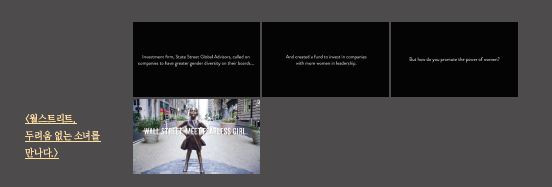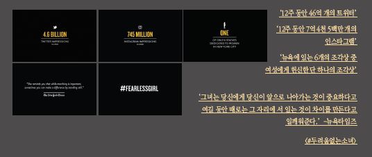 ‘두려움 없는 소녀’라는 이름의 캠페인으로 2017년 칸 국제광고제 ‘Glass, PR, Outdoor, Titanium’ 4개 부문에서 동시에 그랑프리를 수상하며 총 18개의 LION을 수상하는 기록을 세웠다. ‘스테이트 스트리트 글로벌 어드바이저’라는 투자자문 회사가 많은 회사들에게 그들의 이사회에 성 다양성을 가지길 요청했다. 그리고 더 많은 여성들의 리더십을 위해 회사들에게 펀드를 만들어 투자했다. 하지만 ‘당신은’ 어떻게 여성의 힘을 고취할 것인가?