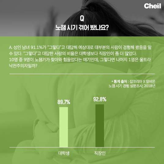 만사가 귀찮고 아무런 의욕이 없을 때가 있다. 의학적으로는 이런 상태를 ‘우울장애’라고 할 수도 있겠지만, 요즘 시쳇말로는 ‘노잼 시기’라고 한다. 노(no) + 잼(재미), 즉 뭘 해도 재미가 없고 시들한 시기가 한동안 지속된다는 뜻이다. 언뜻 생각해 봐도 누구나 그런 경험이 있을 법한데, 이렇게 노잼 시기를 겪는 이유와 극복 방법을 통계로 알아보자.