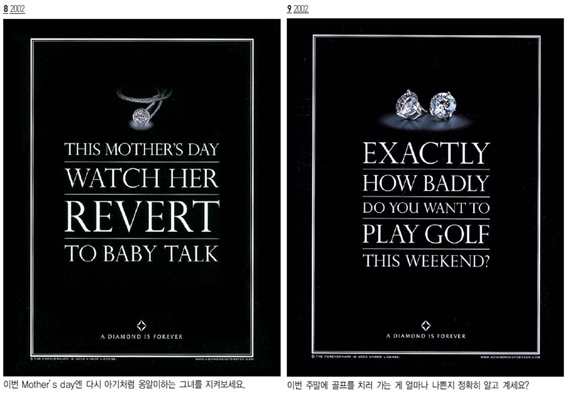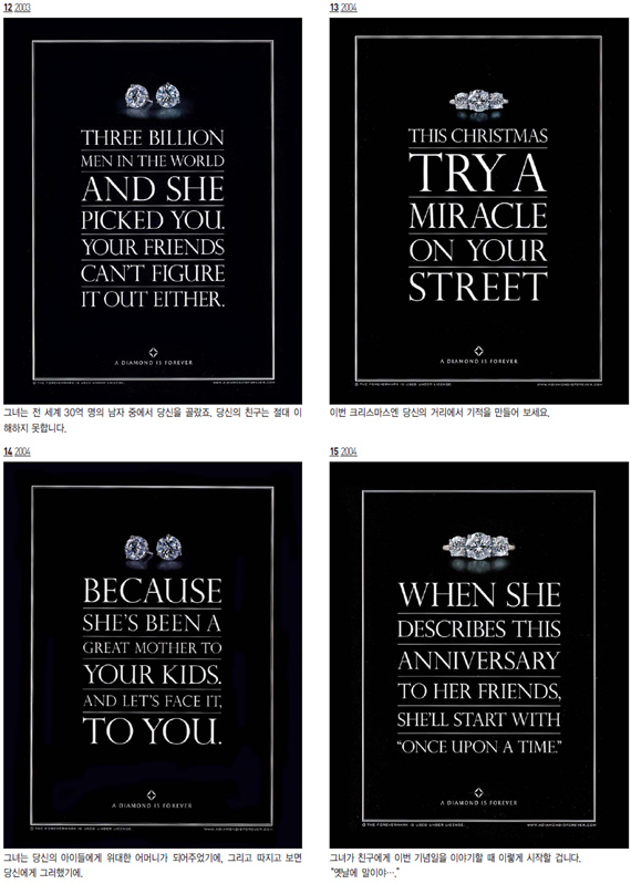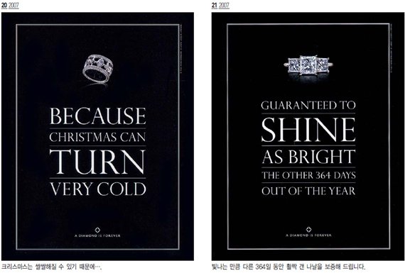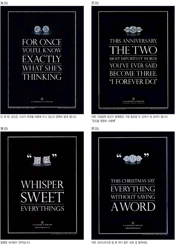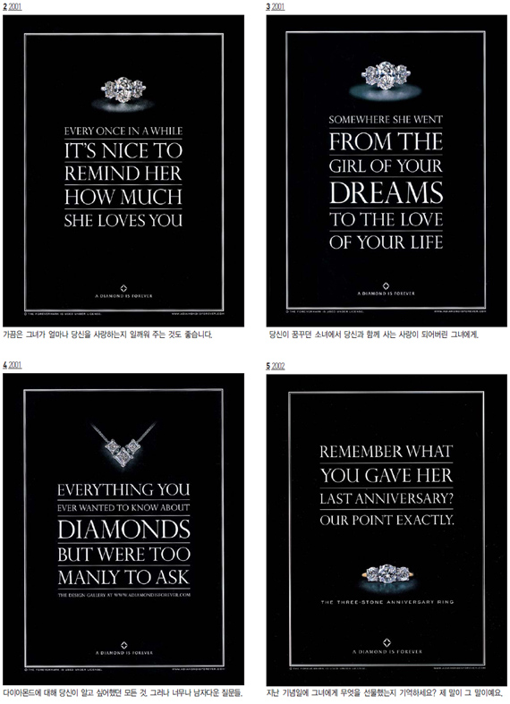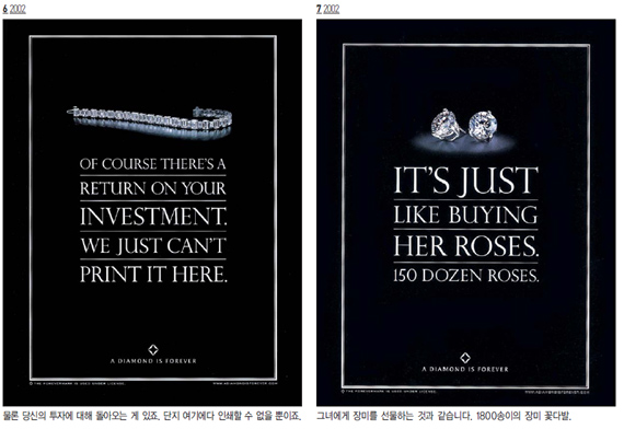 유럽에서는 15세기까지 오직 왕들만이 힘과 용기 그리고 천하무적임을 상징하려는 의미로 다이아몬드를 착용했는데 이것이 시간이 지나면서 영원한 사랑의 상징이 된 것이다. 드비어스는 다이아몬드의 이러한 상징성을 광고적으로 잘 표현해주고 있다. <광고 2>에서 보는 것처럼 이 광고캠페인에서는 드비어스라는 이름을 찾아 볼 수 없다. 카피 몇 줄과 슬로건 그리고 제품뿐인 광고. 그러나‘다이아몬드는 영원히’라는 슬로건만 보더라도 누구나 드비어스의 광고임을 알아챌 수 있다. 도도한 자신감의 표현이랄까? 물론 이러한 자신감은 오랜 세월동안 일관되고 지속적인 광고 캠페인을 해 온 덕분일 것이다.