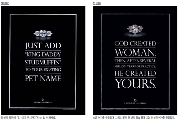 드비어스는 국적과 문화를 초월해 남자들의 이러한 체험적 지식을 위트있는 카피로 귀띔해주고 있다. 바로 영원한 금언이라고나 할까? 몇천 년 전에는 십계명이 새겨진 돌판이 있었다면 드비어스의 이 광고들은 21세기 남자들을 위한 현대판 금언석일지도 모른다.‘ 그녀를사랑한다면 주말마다 골프 치러 갈지 말지어다!’